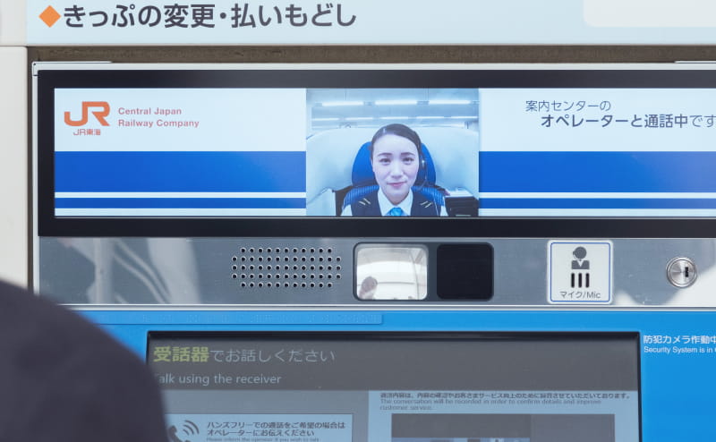 入社後は駅係員の業務を5年ほど経験し、現在はJR東海案内センターに配属。券売機や指定席券売機に設置されたモニター付インターホンを通じて、遠隔で切符の発売や精算などのサポート業務を行っています。これは「お客様サポートサービス」と呼ばれる応対サービスで、駅係員が常駐していない駅に対して、必要に応じて遠隔で対応するもの。券売機の操作方法の説明や、精算対応、指定席券の発券サポートなど、内容は多岐にわたります。